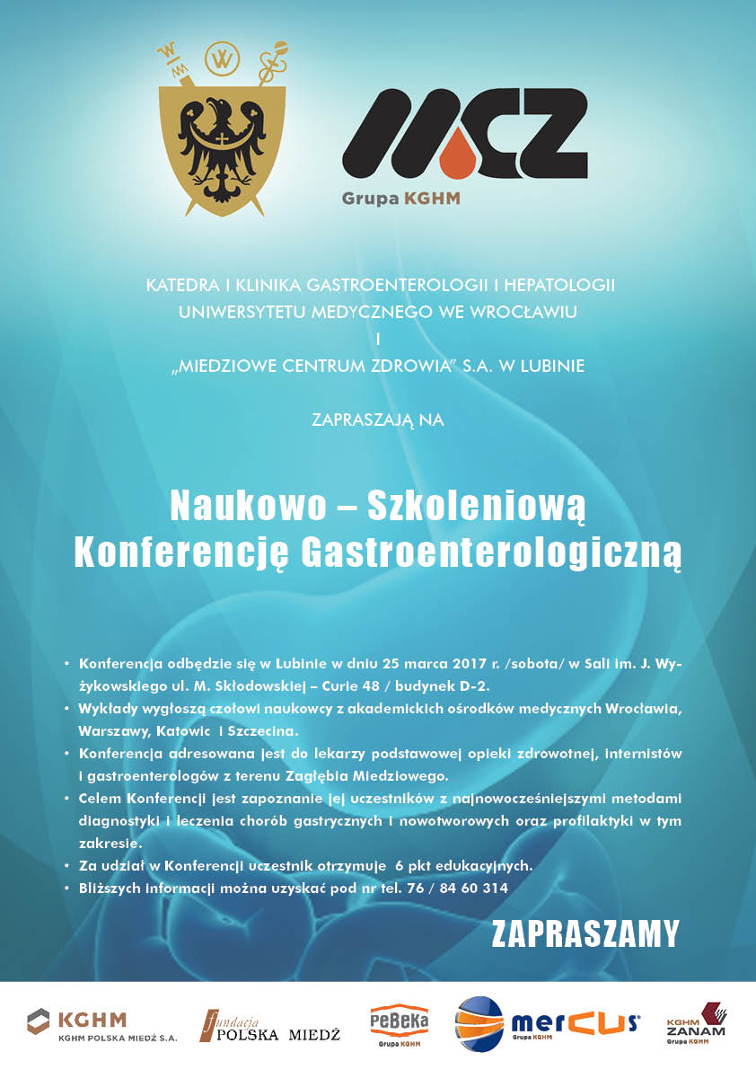 W dniu 25 marca 2017r. odbyła się kolejna edycja Naukowo-Szkoleniowej Konferencji Gastroenterologicznej zorganizowana przez "MIEDZIOWE CENTRUM ZDROWIA" S.A. w Lubinie we współpracy z Katedrą i Kliniką Gastroenterologii i Hepatologii Uniwersytetu Medycznego we Wrocławiu.