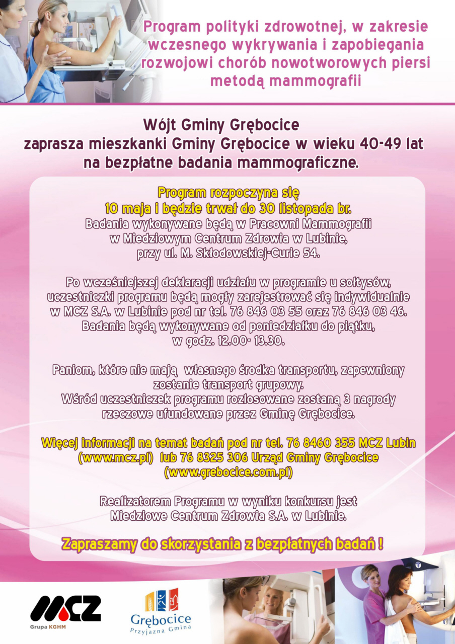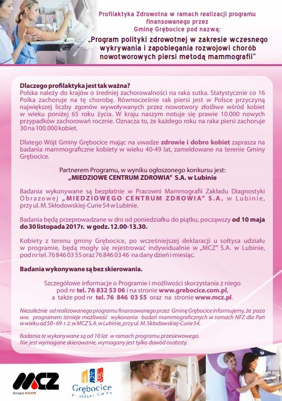 Wdrażany program dotyczy grupy kobiet w wieku 40-49 lat, której nie obejmuje żaden prowadzony przez Ministerstwo Zdrowia program profilaktyczny, a zapadalność i śmiertelność z powodu raka piersi jest w tej grupie bardzo duża. Mieszkanki gminy Grębocice, z adresowanego do nich Programu korzystają bez skierowania i bez kolejek. Program trwa od 10 maja 2017 do końca listopada 2017.