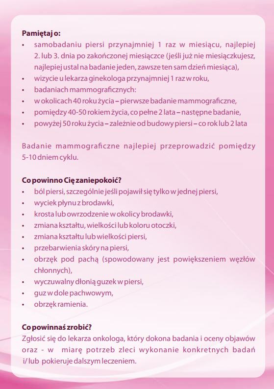 Aktualnie w zakresie dziedziny ochrony zdrowia, jaką jest profilaktyka wykrywania raka piersi, dostępnymi, finansowanymi ze środków publicznych świadczeniami są badania mammograficzne, skierowane do kobiet w wieku od 50 do 69 lat, które przez ostatnie dwa lata nie wykonywały mammografii. Mogą one skorzystać z bezpłatnych badań mammograficznych, w ramach adresowanego do tej grupy programu. Panie z pozostałych przedziałów wiekowych mogą skorzystać z takich badań w ramach ubezpieczenia NFZ. W tym przypadku należy udać się do lekarza specjalisty.