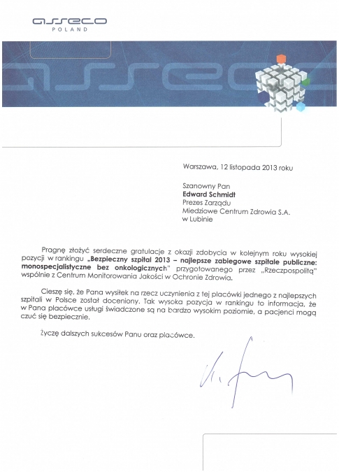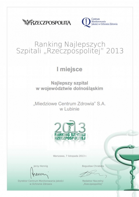 Z satysfakcją informujemy, że "Miedziowe Centrum Zdrowia" S.A. w Lubinie w tegorocznym, jubileuszowym X Rankingu Szpitali pn. "Bezpieczny Szpital", organizowanym przez "Rzeczpospolitą" i Centrum Monitorowania Jakości w Ochronie Zdrowia, zajęło I miejsce wśród dolnośląskich szpitali oraz VIII miejsce w Polsce.