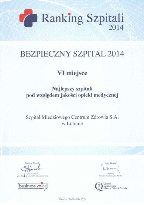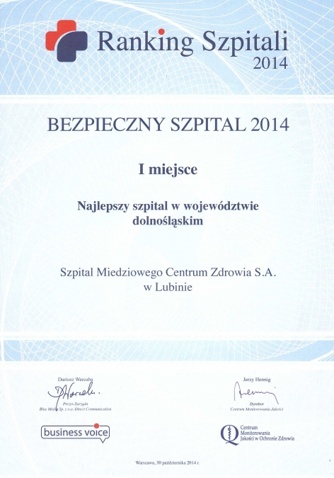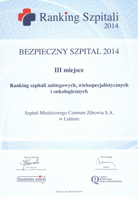 Z przyjemnością informujemy, że Szpital "Miedziowego Centrum Zdrowia" S.A. w Lubinie, w tegorocznej edycji rankingu "Bezpieczny Szpital", zajął I miejsce w województwie dolnośląskim oraz III miejsce w Polsce wśród szpitali zabiegowych, wielospecjalistycznych i onkologicznych. Dodatkowo Szpital nasz uplasował się na VI miejscu wśród szpitali, które zostały wyróżnione w kategorii: jakość opieki medycznej.