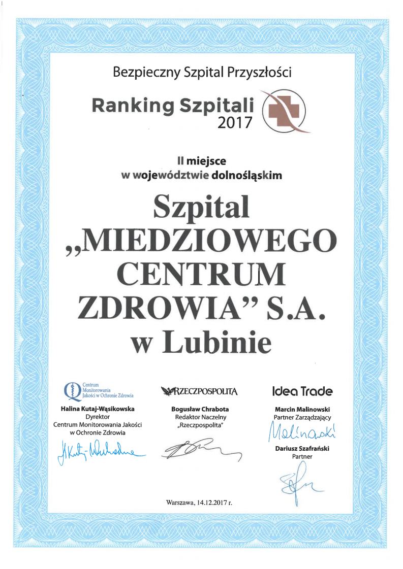 14 grudnia 2017 r. ogłoszono listę tegorocznych laureatów Rankingu Bezpieczny Szpital Przyszłości. Po raz kolejny Szpital "MCZ" S.A. znalazł się w ścisłym gronie zwycięzców. 8 miejsce w Polsce wśród szpitali zabiegowych, wielospecjalistycznych i onkologicznych oraz 2 miejsce na Dolnym Śląsku, to w zasadzie powtórzenie zeszłorocznego sukcesu. W nowej kategorii, stworzonej ze względu na zmianę przepisów wprowadzających tzw. sieć szpitali, zajęliśmy 3 miejsce w Polsce wśród szpitali zakwalifikowanych do II poziomu. "MCZ" S.A. zostało także uhonorowane nagrodą Inspiracje 2017, zainicjowaną po raz pierwszy w tym roku, przeznaczoną dla wyróżniających się w dziedzinie promowania nowych pomysłów, skutkujących zwiększeniem bezpieczeństwa pacjentów. Ten nowy pomysł to otwarte w br. bloki operacyjne Szpitala "MCZ" S.A., których kompleksowe wyposażenie w elementy z miedzi przeciwdrobnoustrojowej jest unikalne nie tylko w Polsce, ale być może i na świecie.