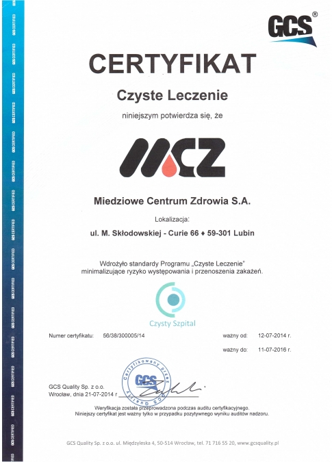 W dniu 4 lipca 2014r. "Miedziowe Centrum Zdrowia" S.A. w Lubinie przystąpiło do pierwszego auditu nadzoru w związku z posiadanym certyfikatem "Czyste Leczenie - Czysty Szpital". Certyfikat ten zaświadcza, że w organizacji przestrzegane są szczegółowe wytyczne dotyczące skutecznego zapobiegania przenoszeniu zakażeń szpitalnych.