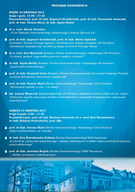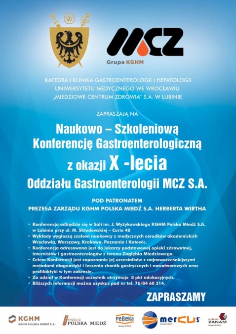 W dniach 24-25 kwietnia 2015r., z okazji X-lecia Oddziału Gastroenterologicznego "MCZ" S.A., odbyła się Naukowo-Szkoleniowa Konferencja Gastroenterologiczna. Wykłady wygłosili czołowi naukowcy z medycznych ośrodków akademickich Wrocławia, Warszawy, Krakowa, Poznania i Katowic. Organizatorami konferencji były: Katedra i Klinika Gastroenterologii i Hepatologii Uniwersytetu Medycznego we Wrocławiu i "MIEDZIOWE CENTRUM ZDROWIA" S.A. w Lubinie.