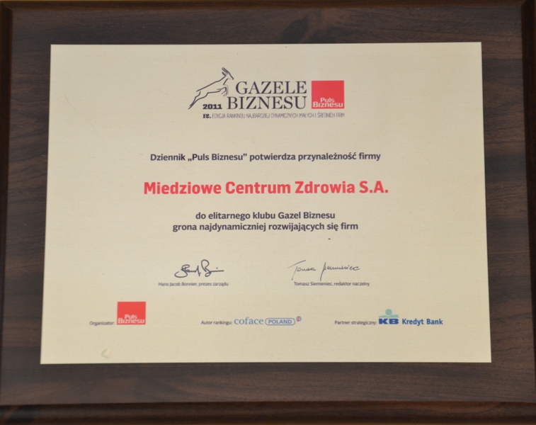 W 2011r. "Miedziowe Centrum Zdrowia" S.A. w Lubinie zostało zakwalifikowane do grona Gazel Biznesu.