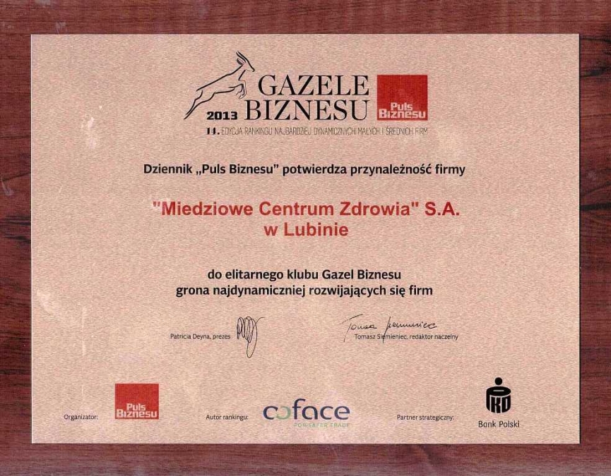 "Miedziowe Centrum Zdrowia" S.A. w Lubinie po raz kolejny zostało uhonorowane tytułem Gazeli Biznesu, potwierdzając tym samym przynależność do grona najdynamiczniej rozwijających się firm w roku 2013.
