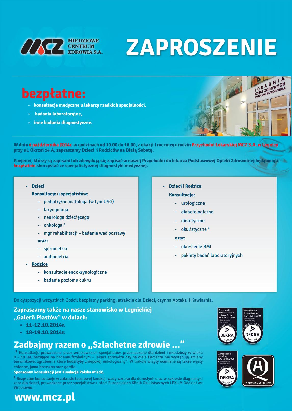 W październiku tego roku mija pierwsza rocznica otwarcia Przychodni Lekarskiej "MCZ" S.A. w Legnicy przy ul. Okrzei 14A.