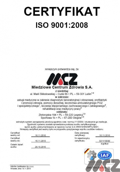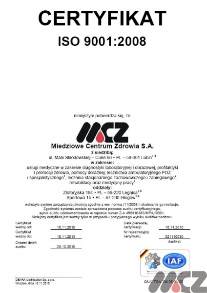 W dniu 16 listopada 2010r. Miedziowe Centrum Zdrowia S.A. w Lubinie uzyskało Certyfikat ISO 9001:2008 w zakresie: diagnostyki laboratoryjnej i obrazowej, profilaktyki i promocji zdrowia, pomocy doraźnej, lecznictwa ambulatoryjnego POZ i specjalistycznego, leczenia stacjonarnego zachowawczego i zabiegowego, rehabilitacji oraz medycyny pracy. Fakt otrzymania tego dokumentu poprzedzony został wielomiesięczną, wytężoną i niełatwą pracą całej załogi Spółki i tylko dzięki temu, jak zaznacza Edward Schmidt, Prezes Zarządu – Dyrektor Naczelny MCZ S.A. w Lubinie, procedury certyfikacyjne zostały uwieńczone sukcesem.
