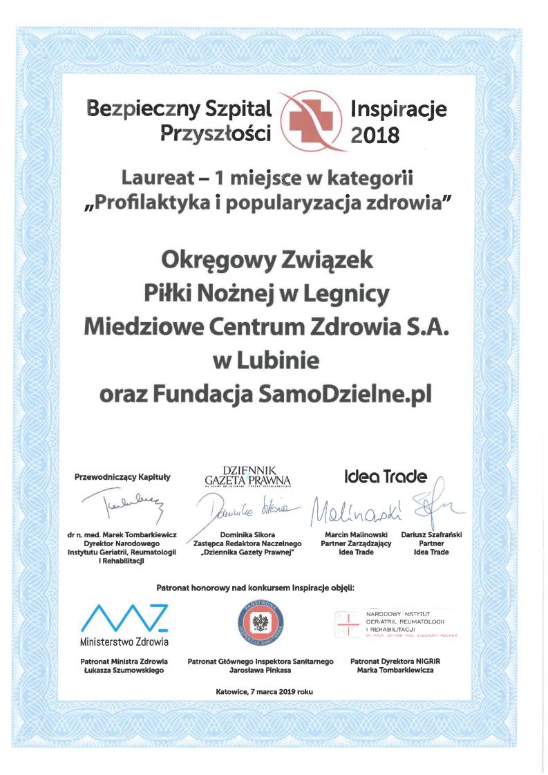 7 marca 2019r., podczas uroczystej Gali w Katowicach, wręczono nagrody INSPIRACJE. Konkurs promuje osoby, instytucje, szpitale, organizacje oraz firmy działające w ochronie zdrowia, które w minionym roku szczególnie zasłużyły się dla krzewienia nowych idei, rozwiązań i technologii, wpływających na zwiększenie bezpieczeństwa pacjentów i pracowników szpitali. Organizatorem Konkursu INSPIRACJE jest firma IDEA Trade we współpracy z "Dziennikiem Gazetą Prawną". Przewodniczącym kapituły jest dr Marek Tombarkiewicz, dyrektor Instytutu Geriatrii, Reumatologii i Rehabilitacji. Patronat honorowy nad INSPIRACJAMI 2018 objął Główny Inspektor Sanitarny dr Jarosław Pinkas.
