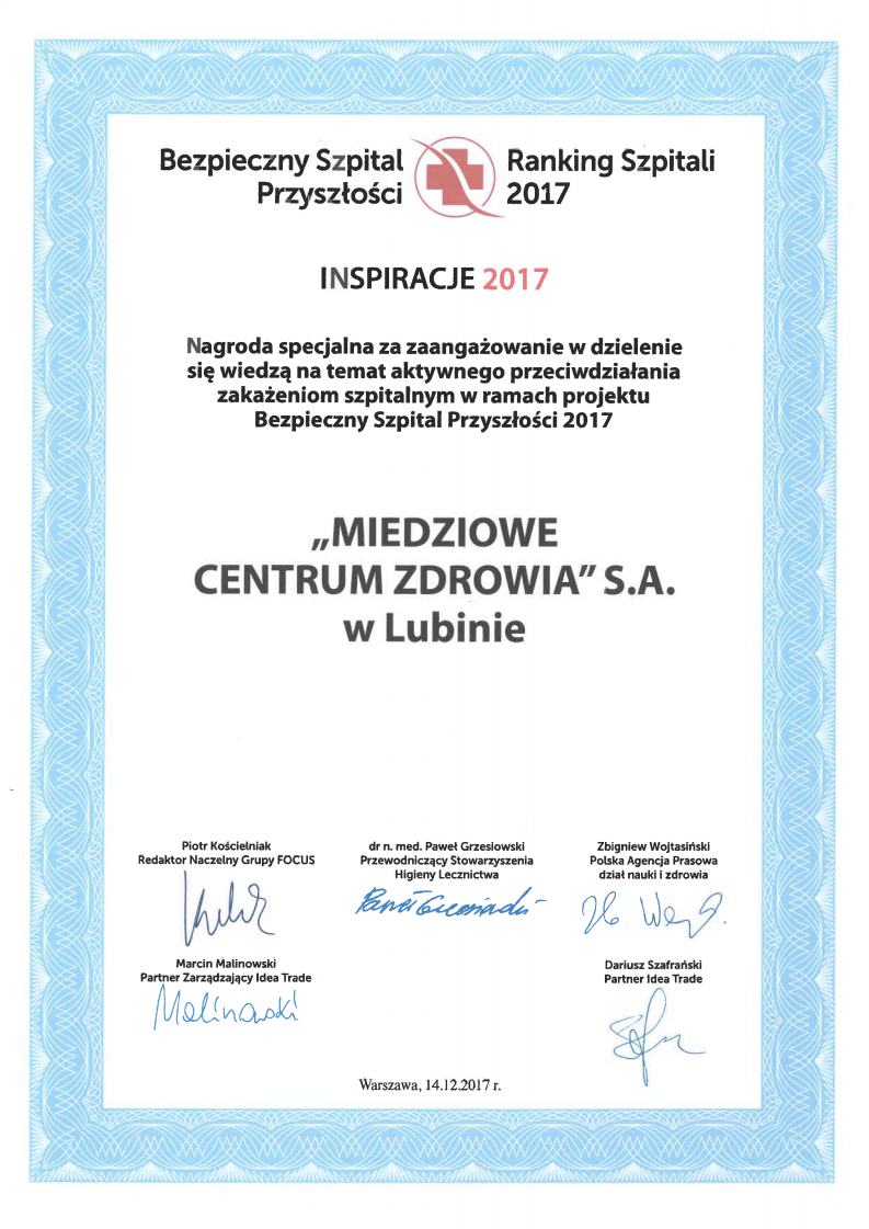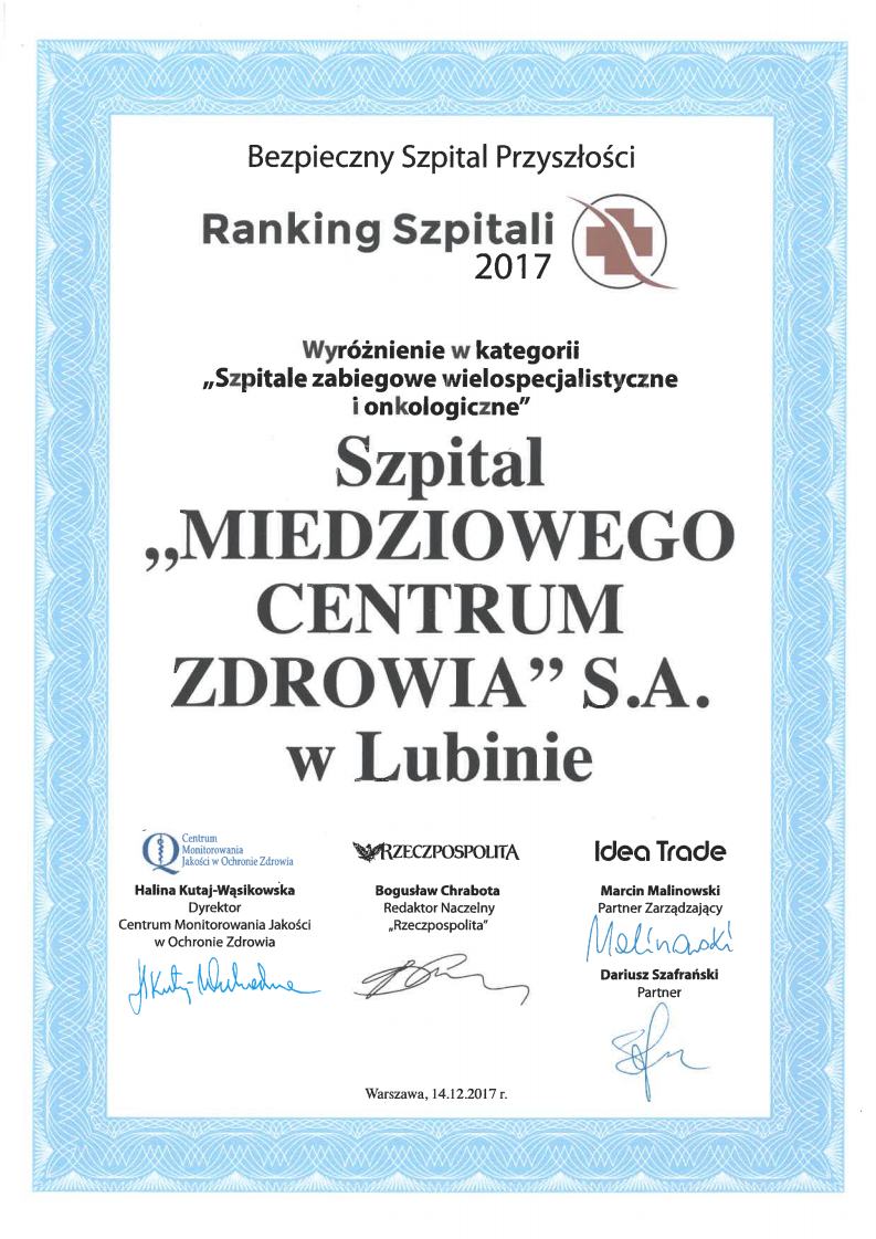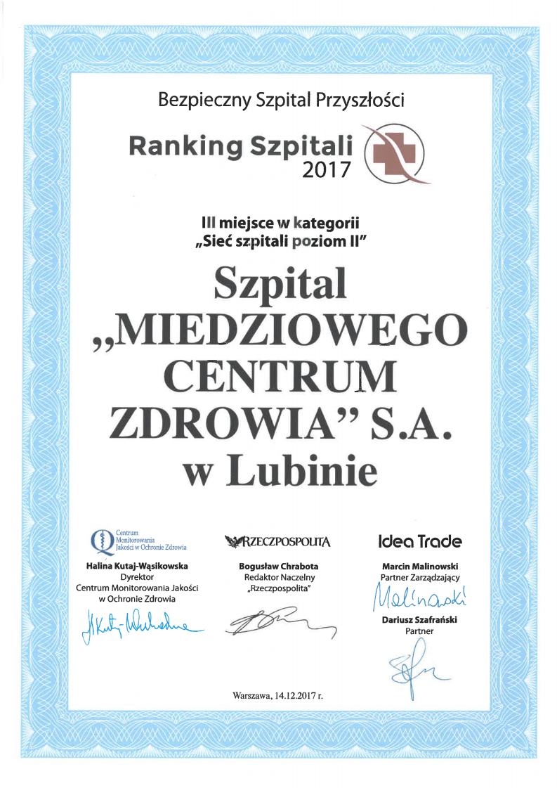 14 grudnia 2017r. ogłoszono listę tegorocznych laureatów Rankingu Bezpieczny Szpital Przyszłości. Po raz kolejny Szpital "MCZ" S.A. znalazł się w ścisłym gronie zwycięzców. 8 miejsce w Polsce wśród szpitali zabiegowych, wielospecjalistycznych i onkologicznych oraz 2 miejsce na Dolnym Śląsku, to w zasadzie powtórzenie zeszłorocznego sukcesu. W nowej kategorii, stworzonej ze względu na zmianę przepisów wprowadzających tzw. sieć szpitali, zajęliśmy 3 miejsce w Polsce wśród szpitali zakwalifikowanych do II poziomu. "MCZ" S.A. zostało także uhonorowane nagrodą Inspiracje 2017, zainicjowaną po raz pierwszy w tym roku, przeznaczoną dla wyróżniających się w dziedzinie promowania nowych pomysłów, skutkujących zwiększeniem bezpieczeństwa pacjentów. Ten nowy pomysł to otwarte w br. bloki operacyjne Szpitala "MCZ" S.A., których kompleksowe wyposażenie w elementy z miedzi przeciwdrobnoustrojowej jest unikalne nie tylko w Polsce, ale być może i na świecie.