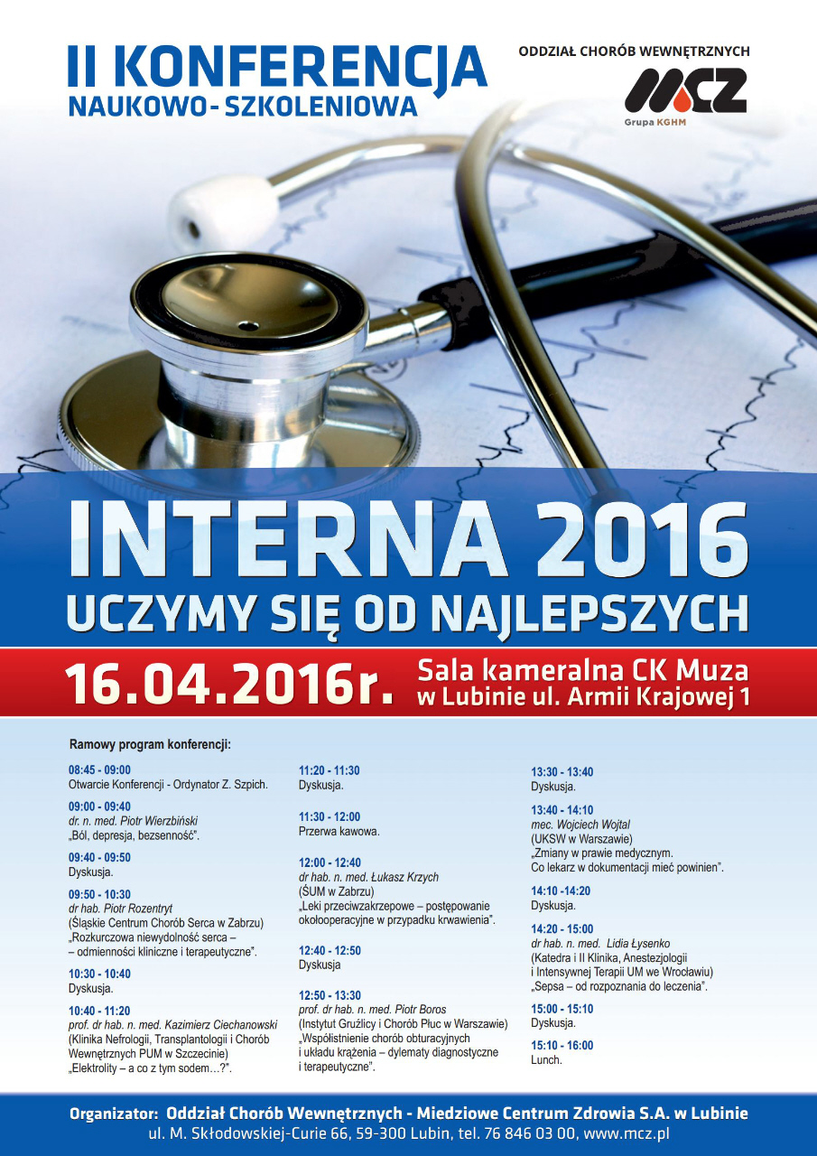 W dniu 16 kwietnia 2016r. Oddział Chorób Wewnętrznych Szpitala "MIEDZIOWEGO CENTRUM ZDROWIA" S.A. w Lubinie zorganizował kolejna edycję konferencji naukowo-szkoleniowej pn. "Interna 2016 - uczymy się od Najlepszych". Adresatami szkolenia byli lekarze wszystkich specjalności placówek "MCZ" S.A. i innych ośrodków Zagłębia Miedziowego oraz zainteresowani tematyką pracownicy KGHM Polska Miedź S.A.