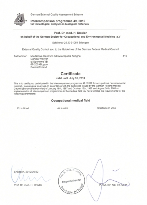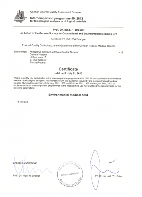 W lipcu 2012r. Laboratorium w Głogowie po raz drugi uczestniczyło w międzynarodowej kontroli jakości oznaczeń toksykologicznych (German External Quality Assessment Scheme, G-EQUAS 49) i uzyskało certyfikaty dla wszystkich wysłanych w ramach tej kontroli prób.