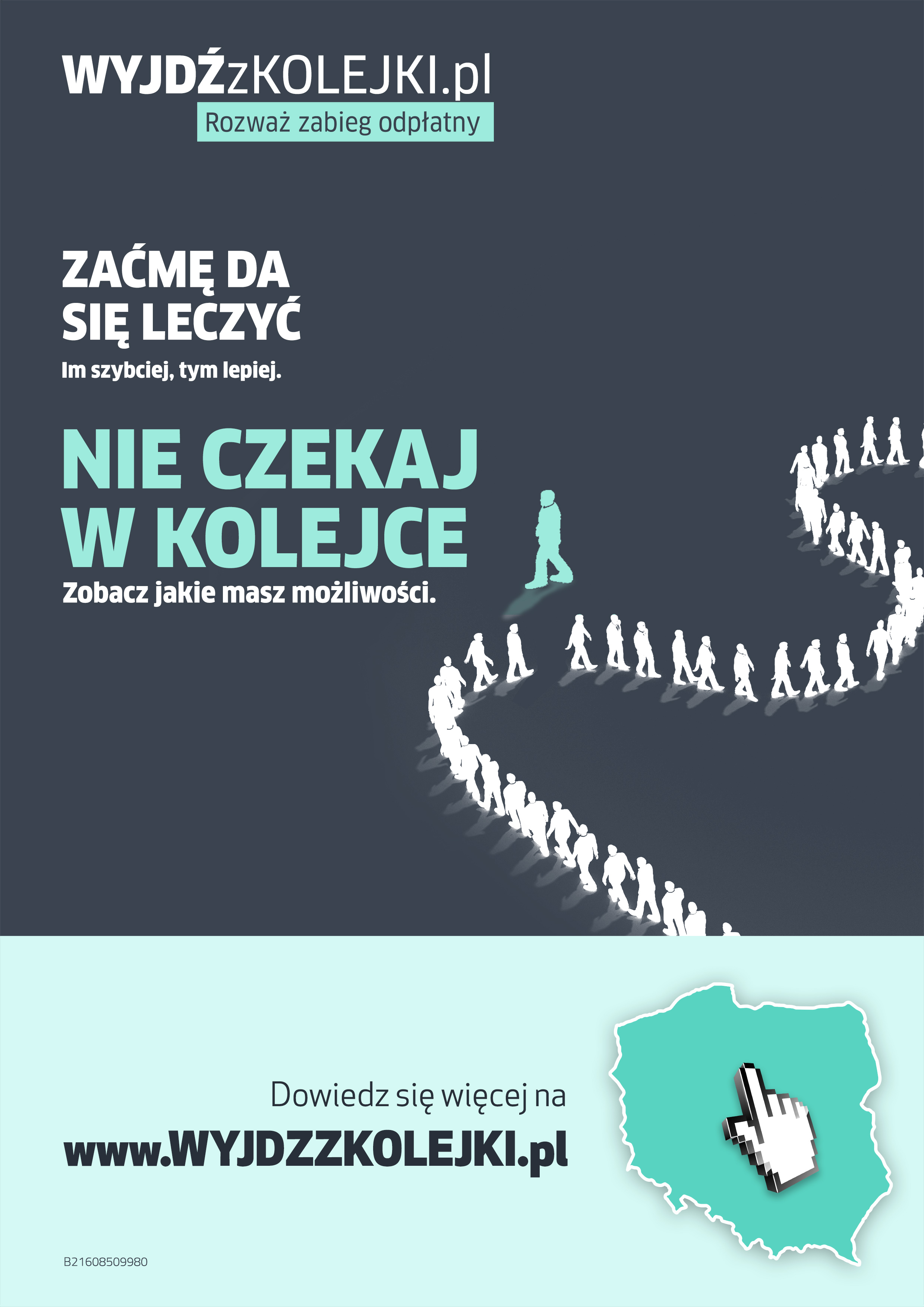 "Wyjdź z kolejki. Rozważ zabieg odpłatny." to kampania edukacyjna, której celem jest upowszechnianie wiedzy na temat zaćmy, w tym w szczególności jej przyczyn, objawów, sposobów leczenia, procedur związanych z dostępem do świadczeń zdrowotnych i miejsc ich wykonywania, jak również propagowanie profilaktyki.