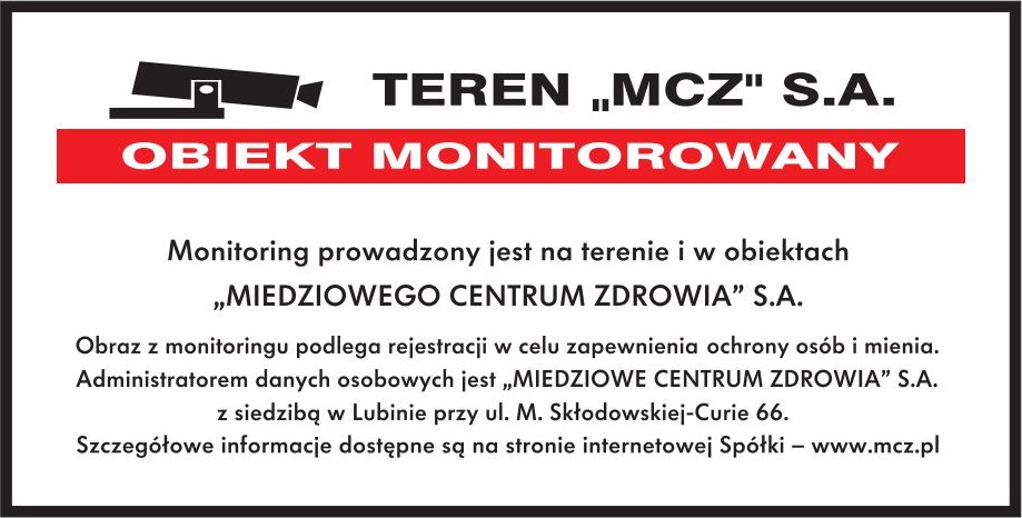 - Pani/Pana dane osobowe w zakresie wizerunku są rejestrowane w sposób automatyczny przez system monitoringu w związku z przebywaniem na terenie „MIEDZIOWEGO CENTRUM ZDROWIA” S.A.