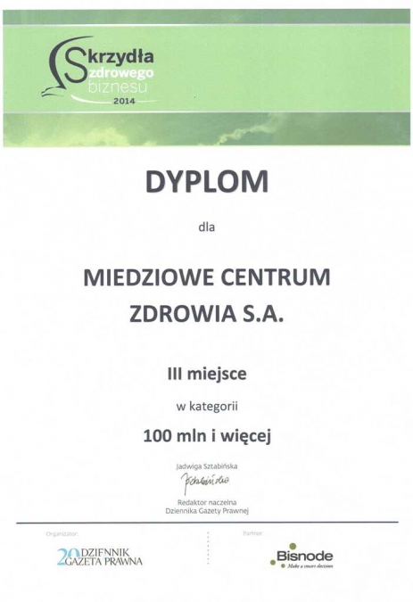 "Miedziowe Centrum Zdrowia" S.A. w Lubinie znalazło się na III miejscu listy laureatów w kategorii 100 ml zł i więcej zanjdując się w takim gronie jak: Centrum Medycznym HCP Sp. z o.o. Uzdrowiska Kłodzkie SA Grupa PGU, Szpital Specjalistyczny im. Ludwika Rydygiera w Krakowie sp. z o.o., Centralny Szpital Kliniczny Ministerstwa Spraw Wewnętrznych w Warszawie i Mazowiecki Szpital Bródnowski w Warszawie.