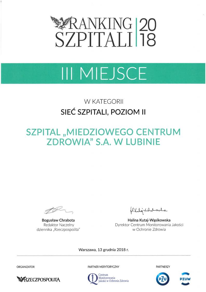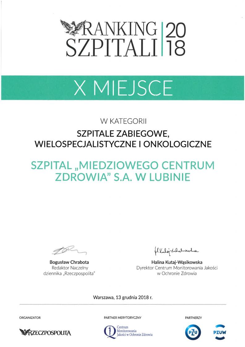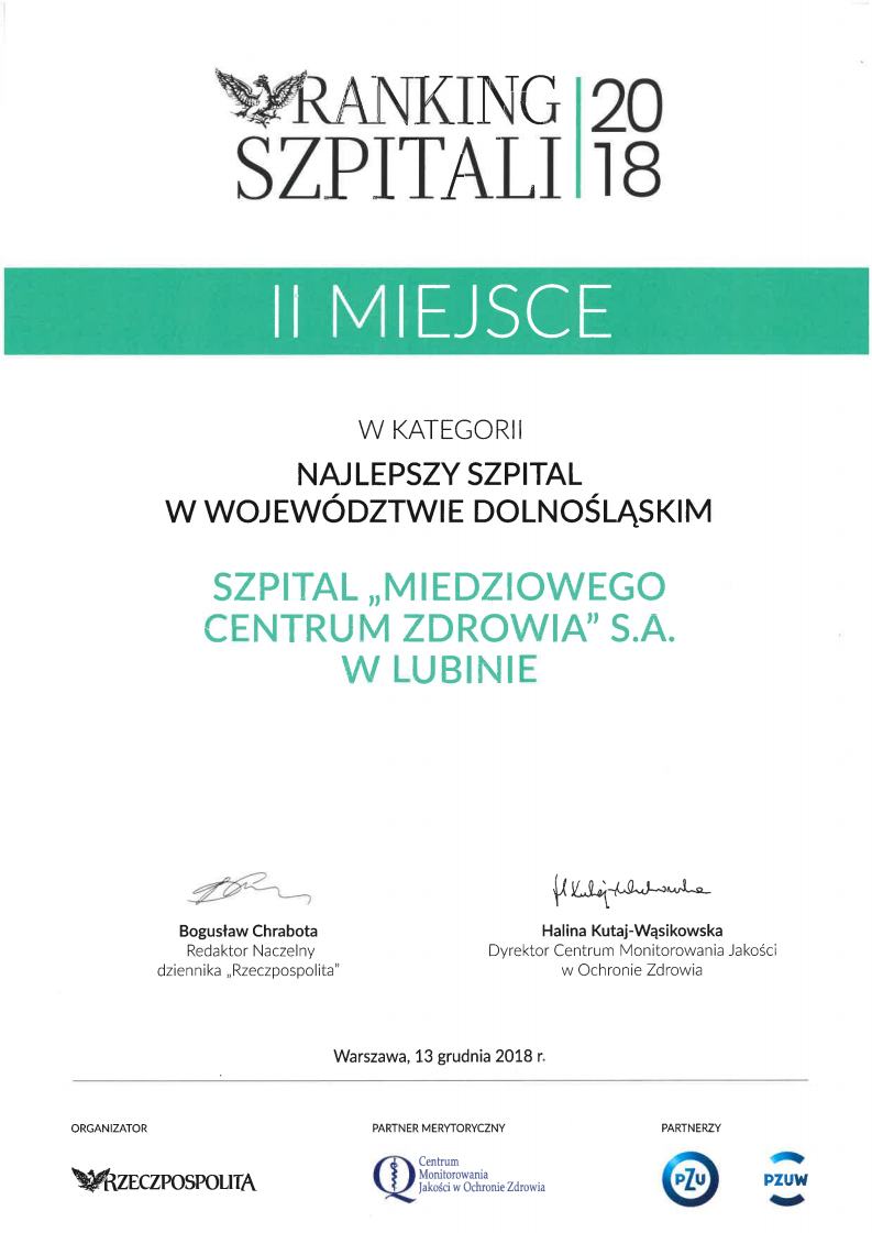 W dniu 13.12.2018r., podczas jubileuszowej XV edycji, ogłoszono wyniki tegorocznego rankingu szpitali prowadzonego przez Rzeczpospolitą i Centrum Monitorowania Jakości w Ochronie Zdrowia.