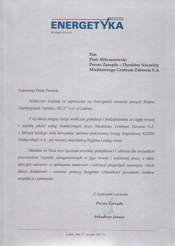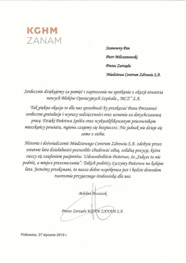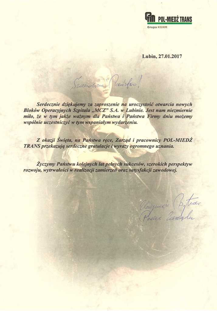 W obecności Wicewojewody Dolnośląskiego Kamila Krzysztofa Zielińskiego, Dyrektora Dolnośląskiego Oddziału Wojewódzkiego Narodowego Funduszu Zdrowia Andrzeja Oćwieji, Wiceprezesa Zarządu KGHM Polska Miedź S.A. Jacka Raweckiego oraz przedstawicieli Parlamentu i licznie zgromadzonych gości reprezentujących Oddziały i Spółki Grupy Kapitałowej KGHM Polska Miedź S.A., samorządy terytorialne oraz pracowników "MCZ" S.A. dokonano przecięcia wstęgi. W ten sposób oficjalnie otwarto bardzo nowoczesne Bloki, które będą służyć pacjentom Oddziału Okulistycznego i Laryngologicznego.