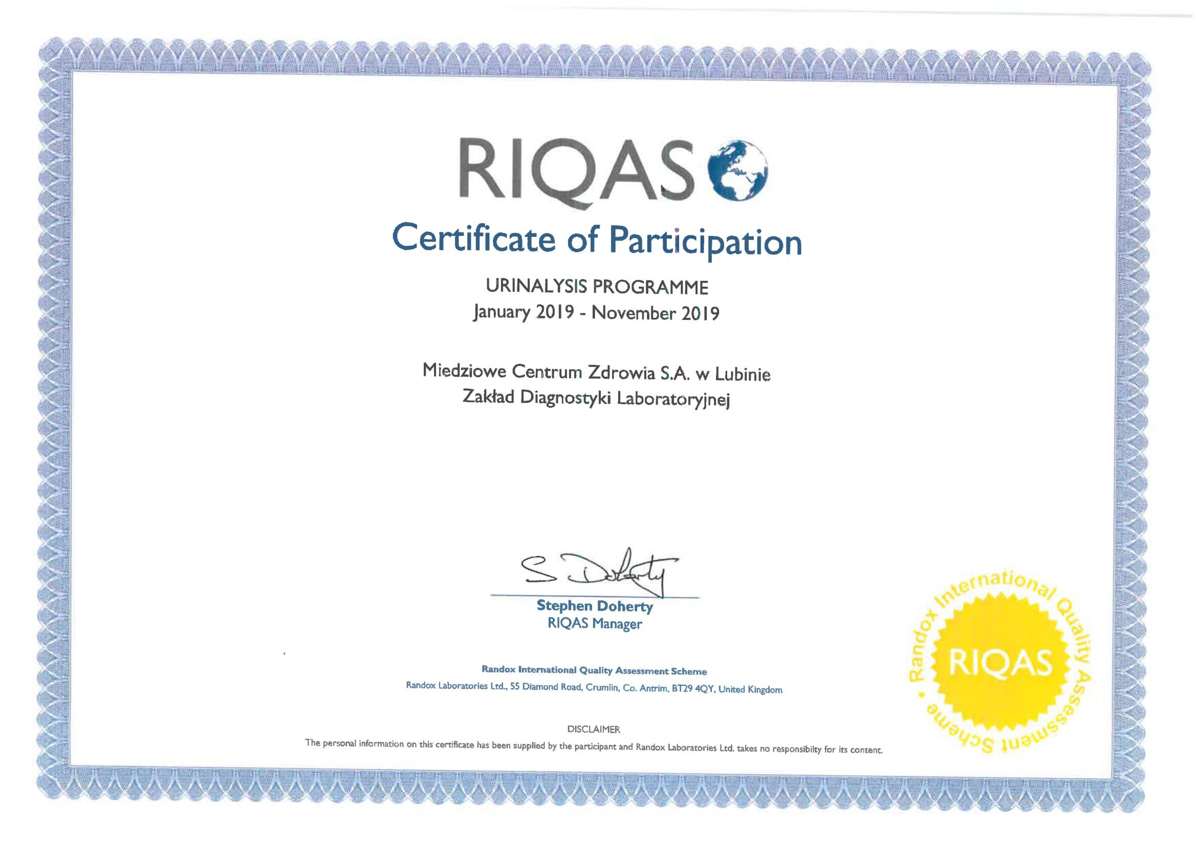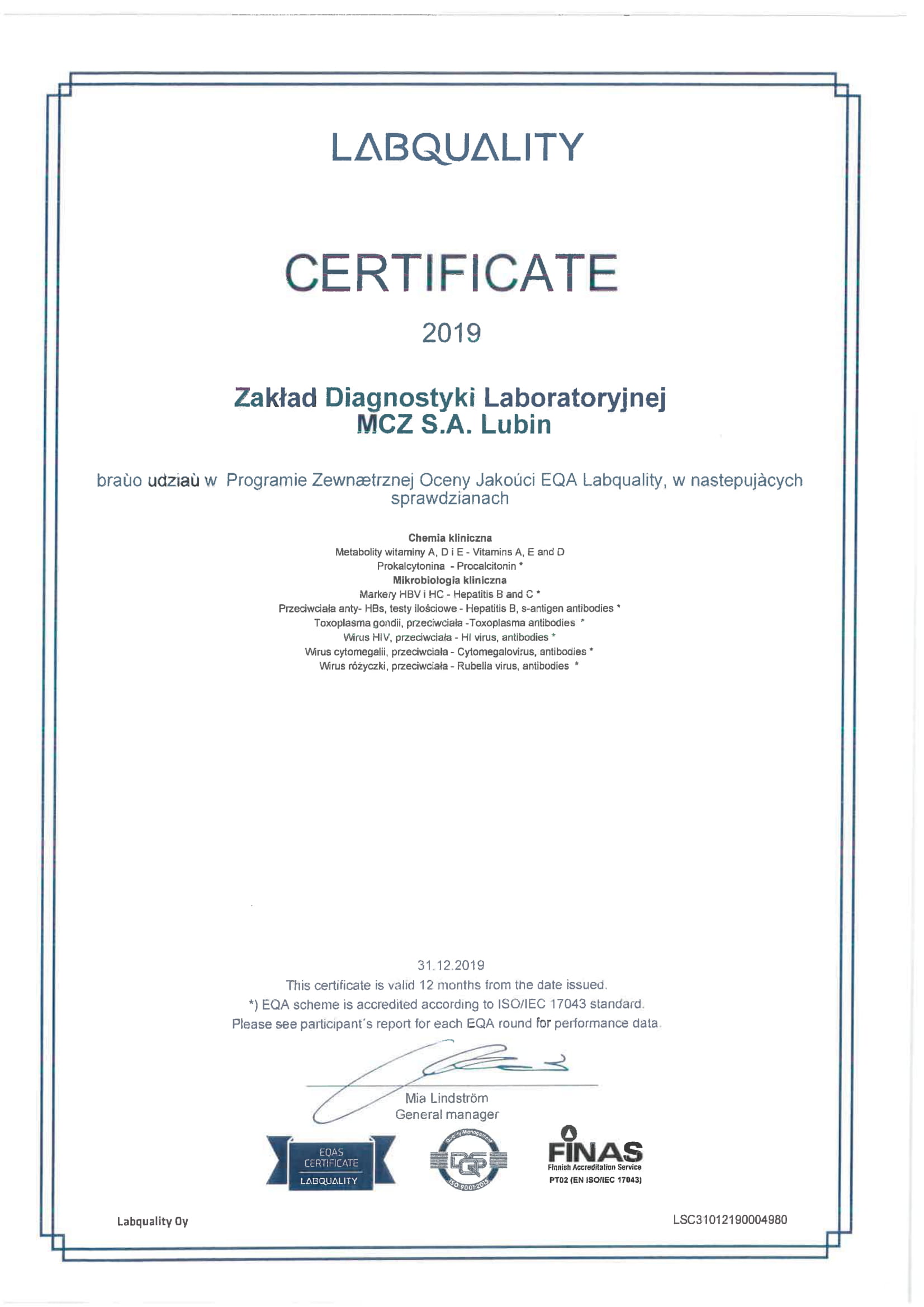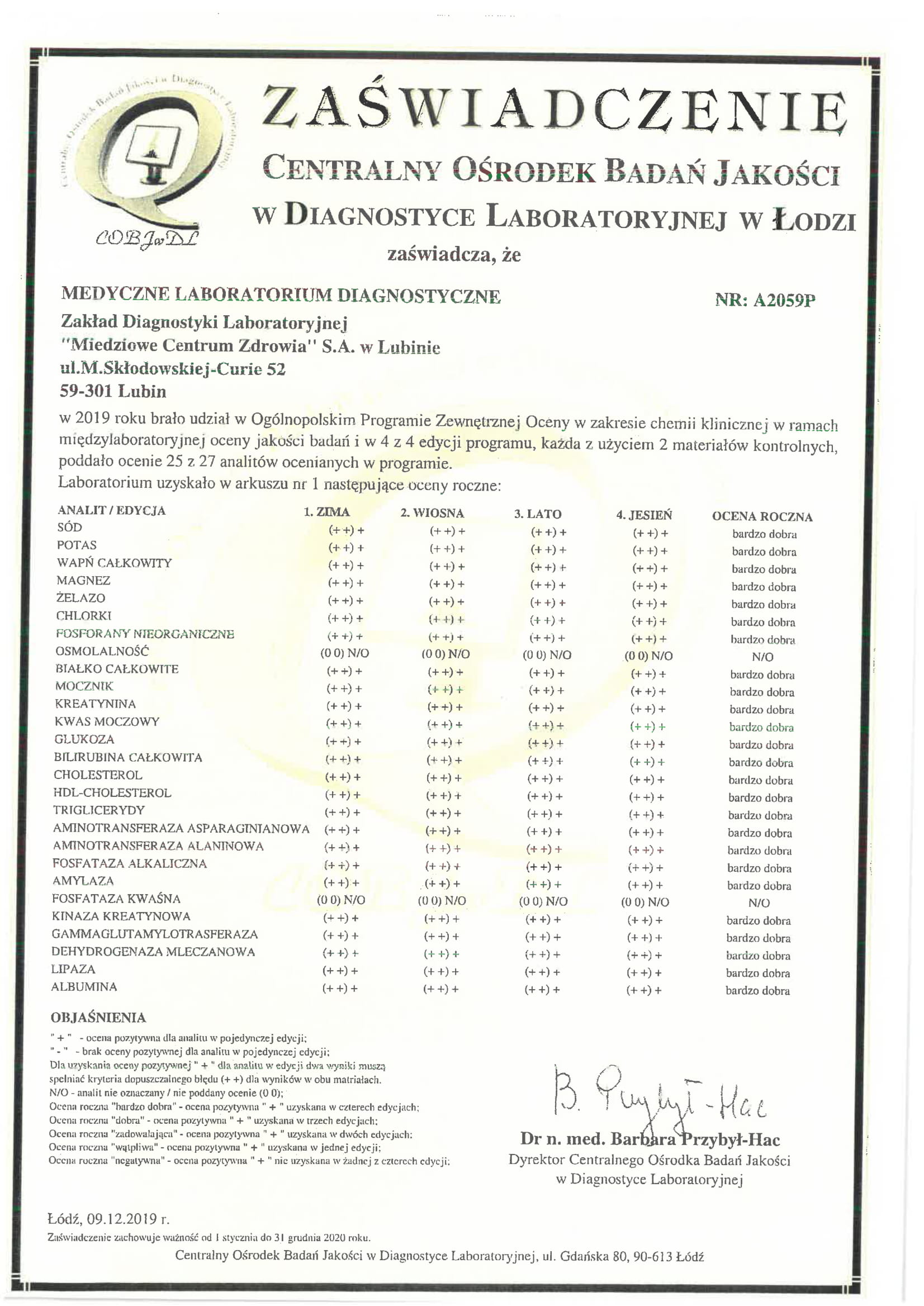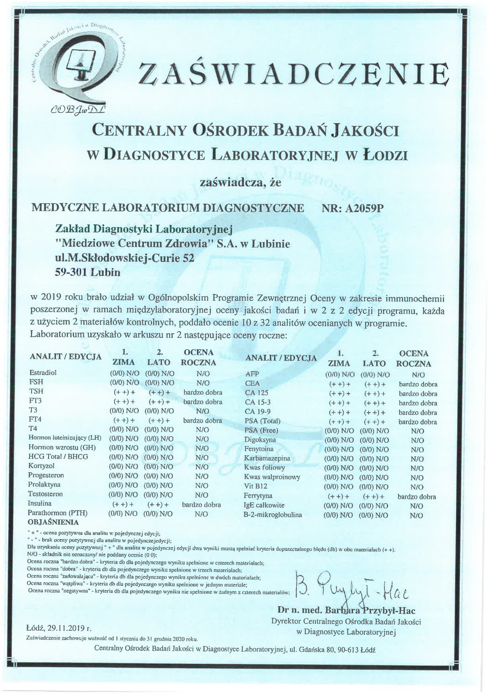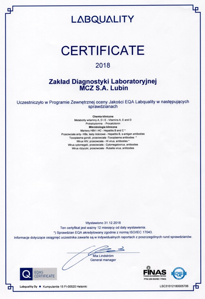 O marce Laboratorium oprócz opinii pacjentów świadczą zdobyte certyfikaty jakości , w tym międzynarodowe, a jakość badań na bieżąco jest potwierdzana w krajowych i zagranicznych badaniach kontrolnych.