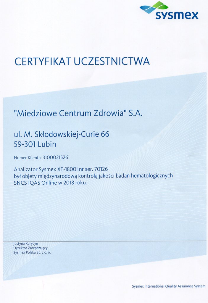 Zakład Diagnostyki Laboratoryjnej "MCZ" S.A. w Lubinie, posiada dwa cytometry przepływowe do oznaczeń morfologii krwi: SYSMEX XT 1800i - 5 diff oraz SYSMEX XT 2000i - 5 diff z możliwością oznaczania retikulocytów. Wyposażenie i uruchomienie z dniem 17.05.2013r. w Laboratorium Centralnym ZDL "MCZ" S.A. w Lubinie nowego analizatora hematologicznego - cytometru przepływowego SYSMEX 1800i umożliwia, oprócz rozdziału leukocytów 5 diff, oznaczenie parametru - IG%/IG# - procent/liczba niedojrzałych garnulocytów. Będący na wyposażeniu pracowni hematologii analizator - cytometr przepływowy SYSMEX 2000i posiada tor pomiarowy do oznaczania retikulocytów i płytek metodą optyczną.