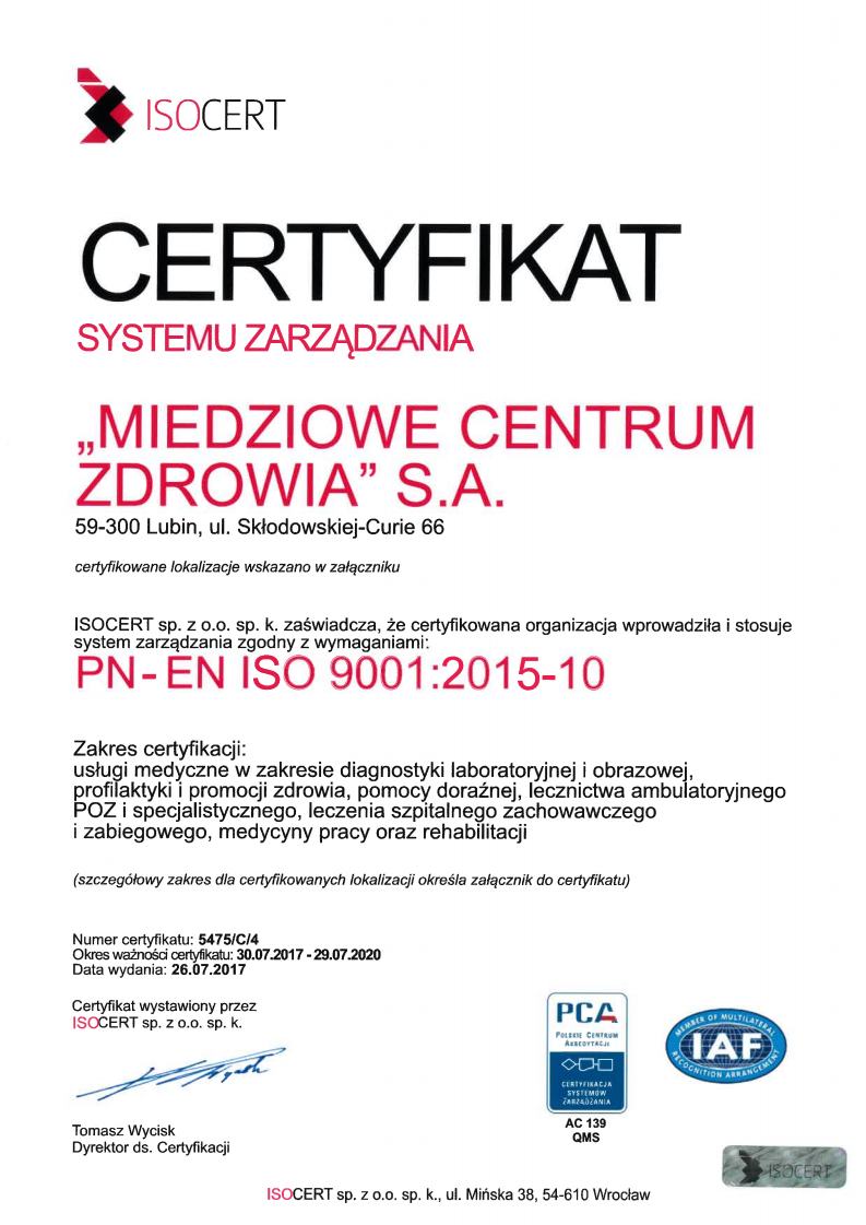 Podkreślić należy, że "MIEDZIOWE CENTRUM ZDROWIA" S.A. w Lubinie jest jedną z nielicznych instytucji medycznych w kraju, które system zarządzania certyfikowały w oparciu o najnowsze wydania norm PN-EN ISO 9001:2015 oraz PN-EN ISO 14001:2015. Zarząd Spółki mając na uwadze dobro pacjentów oraz najwyższą jakość świadczonych usług postanowił recertyfikować Zintegrowany System Zarządzania wg najnowszych standardów.